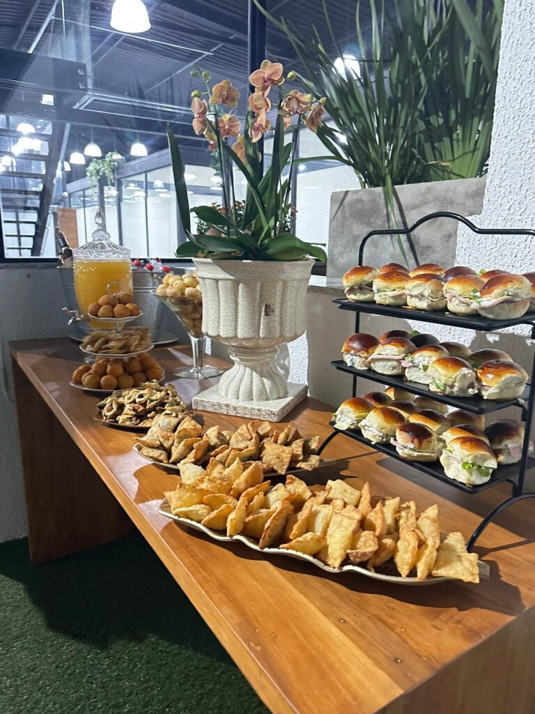 Coffee Break com Café coado, Pão de queijo, bolo caseiro, mini sanduíche e muito mais.